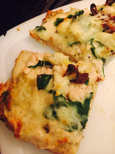 The first pizza I made was a white pizza with chicken, garlic, spinach, and artichoke. The second pizza was a Hawaiian pizza with Canadian bacon, prosciutto, pineapple, bacon, black olives, red onions with two types of cheeses and topped with arugula.